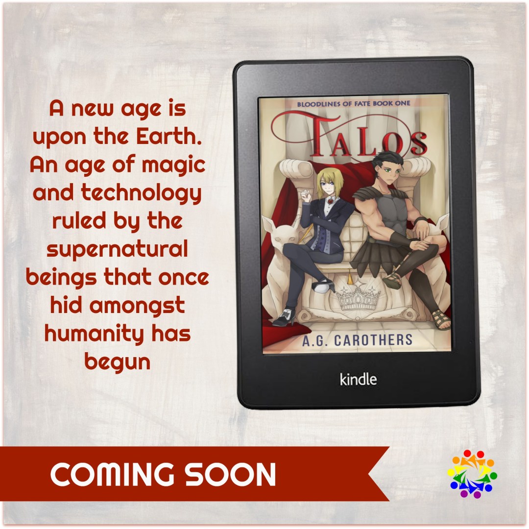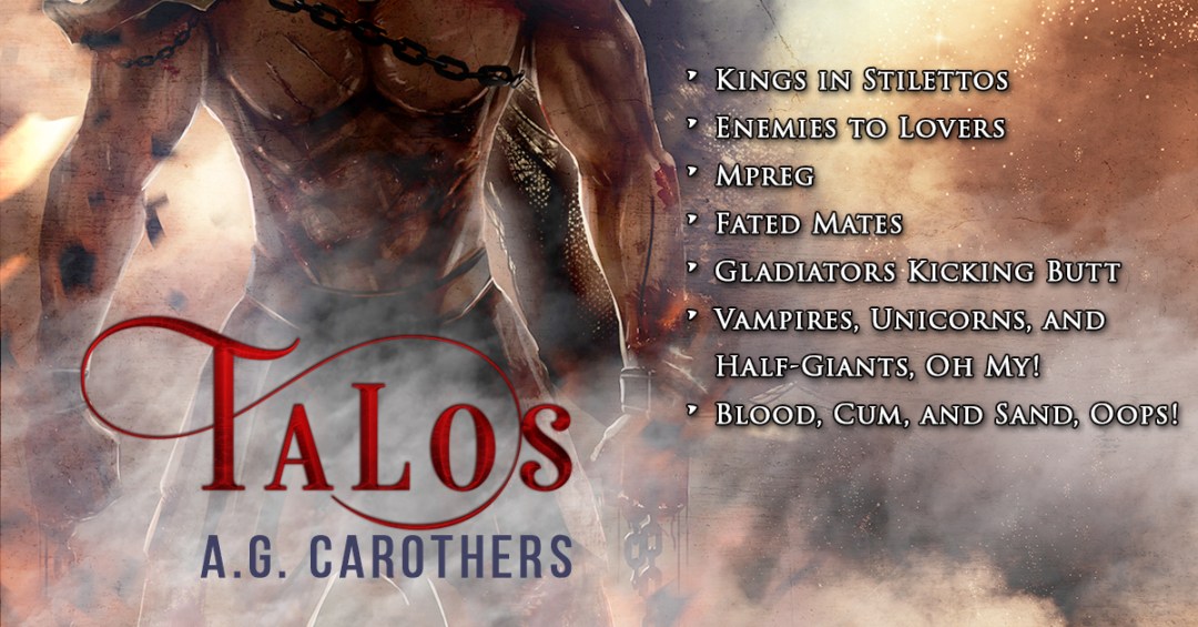 COVER REVEAL Book Title: Talos: Bloodlines of Fate, Book One Author and Publisher: A. G. Carothers Cover Artist: Samantha Santana, Amai Designs with illustration by Maberan Release Date: September 7, 2020 Genre/s: Urban Fantasy/Paranormal, MPreg Trope/s: Enemies to Lovers, Fated Mates, First Time, Hurt/Comfort Themes: Assassination Attempt, Supernatural Society, BDSM, Size Difference, [Vampires, Unicorns, and … Continue reading Cover Reveal, Excerpt & Giveaway: Talos: Bloodlines of Fate by A. G. Carothers
