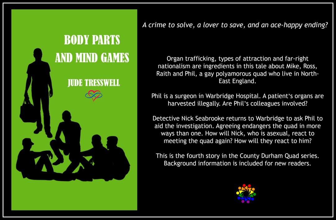 BOOK BLAST Book Title: Body Parts and Mind Games (County Durham Quad Book 4) Author: Jude Tresswell Publisher: Self published Release Date: November 4, 2019 Genre/s: Crime, LGBTQ Trope/s: Sexual/asexual relationship; polyamorous relationship Themes: Navigating ace/non-ace relationship; loyalty Heat Rating: 2 flames Length: 60 000 words/ 228 pages It can be read alone, although it … Continue reading Blog Tour: Body Parts & Mind Games by Jude Tresswell