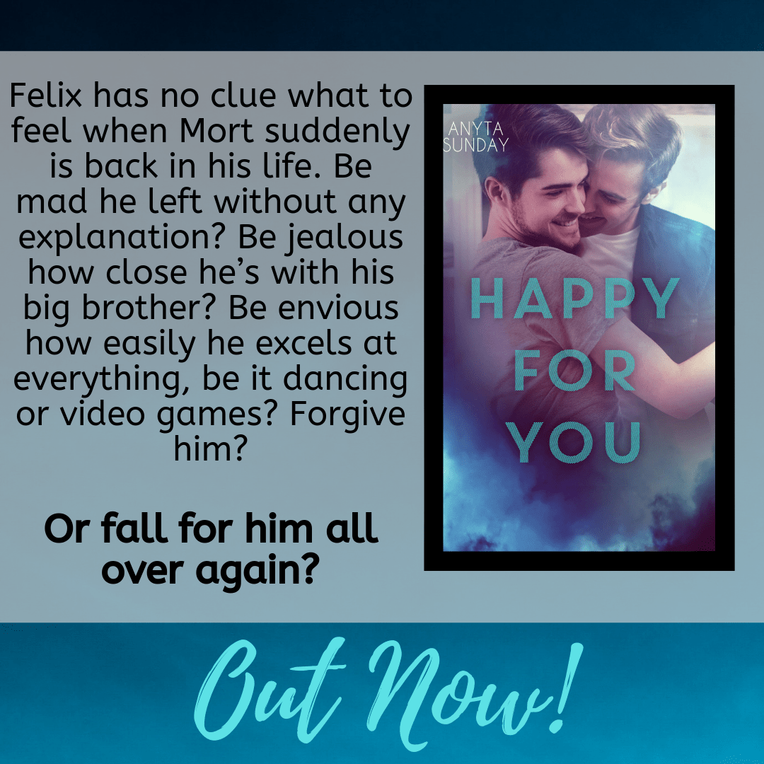 Happy For You (Love & Family, Book 3) by Anyta Sunday Release Date (Print & Ebook): September 10, 2019 Length (Print & Ebook): 60,000 words Tropes: brother’s best friend, second chances, family drama, friends-to-lovers, slow burn, found family Genre: New Adult, light-hearted contemporary gay romance Subgenre: Contemporary Gay Romance Warnings: Depression and generalized anxiety (of a … Continue reading Release Blitz & Giveaway: Happy for You by Anyta Sunday